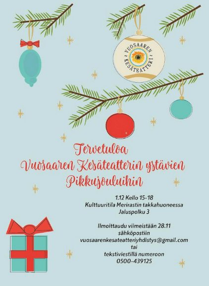 Kesäteatterimme järjestää perinteiset pikkujoulut 1.12.2024 klo 15-18 Kulttuuritila Merirastin takkahuoneessa. Ohjelmassa mm.